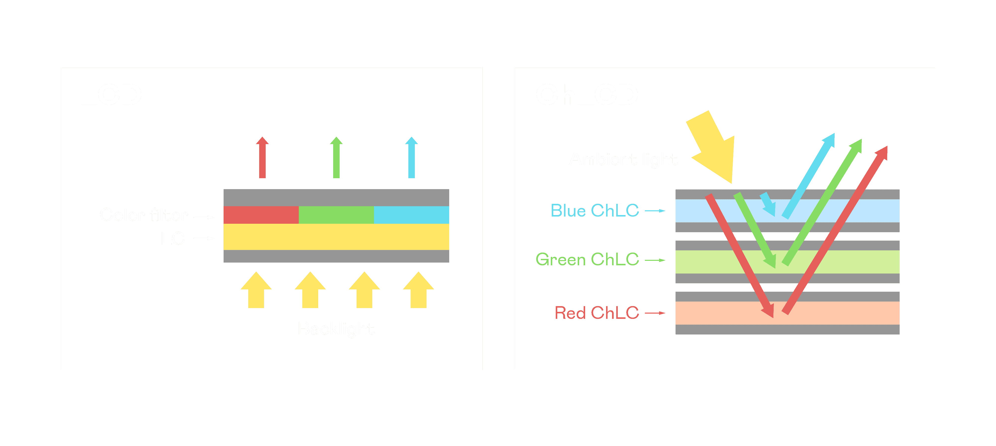 ChLCD 胆固醇液晶就如同纸张一样,,透过反射环境光来显示影像,,,,因此长时间观看不易造成人眼视觉疲劳,,,,可达到护眼效果。。当处于户外阳光下使用,,,,LCD 影像容易失真而不易观看,,,但胆固醇液晶仍可维持较佳的影像品质。。。